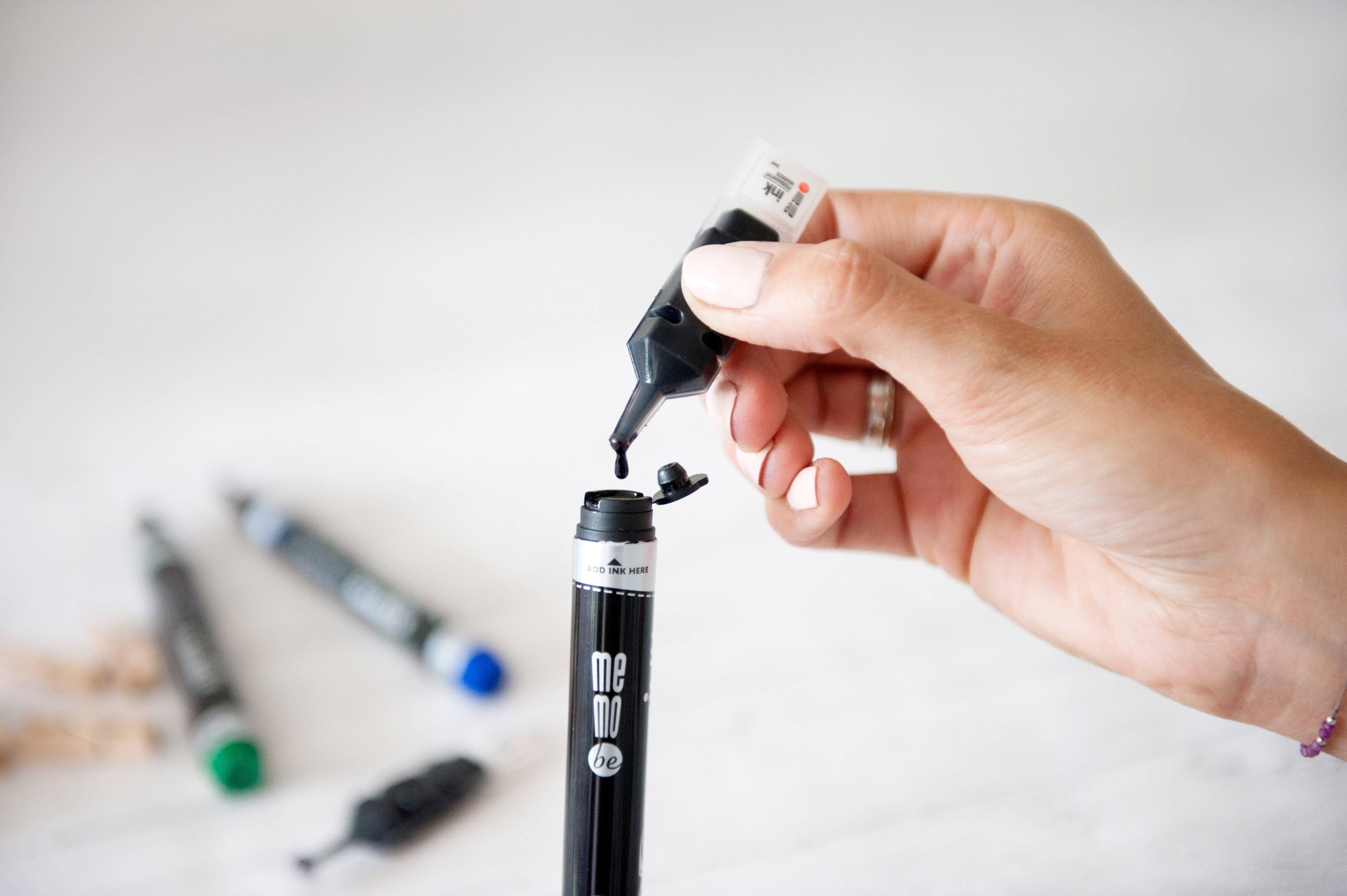 Markery permanentne MemoBe. Markery doskonale nadają się do wykonywania napisów, oznaczeń i dekoracji na większości gładkich powierzchni. Trwały tusz na bazie alkoholu jest odporny na ścieranie. Okrągła końcówka o grubości linii pisania 2-3 mm. Skuwka ze specjalną końcówką ułatwiającą rozcinanie taśmy, otwieranie kartonów i uzupełnianie tuszu. Markery nadają się do ponownego uzupełnienia dedykowanym do tego, załączonym tuszem, dzięki czemu są bardziej ekologiczne i ekonomiczne. Zatyczka markerów z klipsem wyposażona jest w specjalny ząbek, który ułatwia czyste i komfortowe napełnienie. W zestawie 2 ampułki z tuszem. Sposób uzupełniania: za pomocą ząbka w zatyczce delikatnie podważ zabezpieczenie w górnej części markera, przed otwarciem ampułki delikatnie nią wstrząśnij, ostrożnie otwórz ampułkę i wlej całą zawartość do markera, zamknij szczelnie zabezpieczenie i pozostaw zamknięty marker końcówką do dołu, po chwili marker znów jest gotowy do użycia. Zestaw marker + 2 ampułki zapewnia aż 3 razy dłuższą żywotność produktu. Dostępne 4 kolory: czarny, czerwony, niebieski, zielony.
