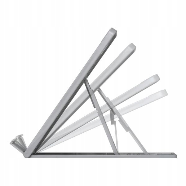 - Skladana podwójna podstawka zapewnia elastyczne ustawienia wysokości i kąta nachylenia, a jednocześnie zajmuje malo miejsca na biurka