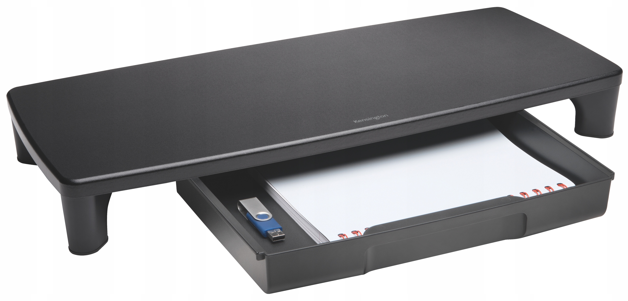 Podstawka pod monitor z szufladą Kensington SmartFit zapewnia ergonomiczne korzyści wynikające z ustawienia ekranu na optymalnej dla oczu wysokości, a takze dodatkowe miejsce do przechowywania akcesoriów biurowych.