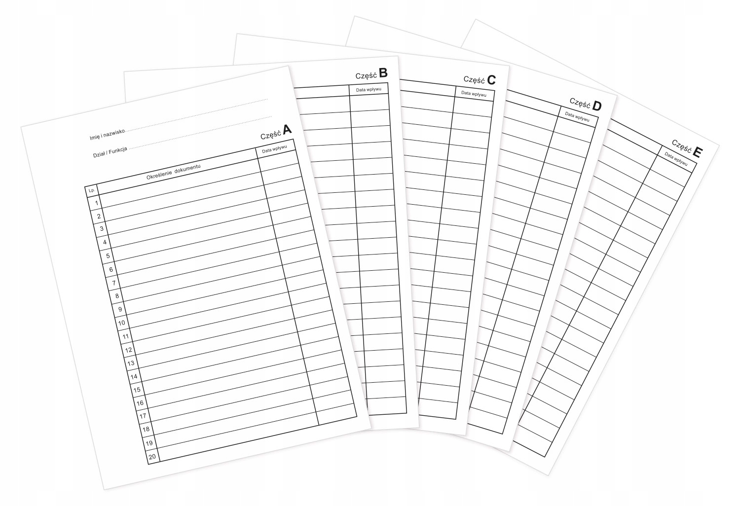 - Posiada przekładki A, B, C, D, E wykonane z papieru offsetowego o gramaturze 170 g/m2.