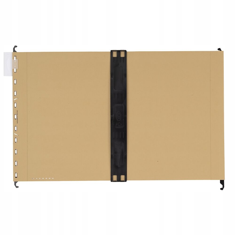 Teczka zawieszkowa wykonana z mocnego kartonu w bezowym kolorze. Dno o szerokości 4 cm pozwala pomieścic do 380 kartek. Na dnie teczki znajduje sie plastikowa wkladka z bocznymi ogranicznikami, zabezpieczającymi dokumenty przed wypadaniem.
