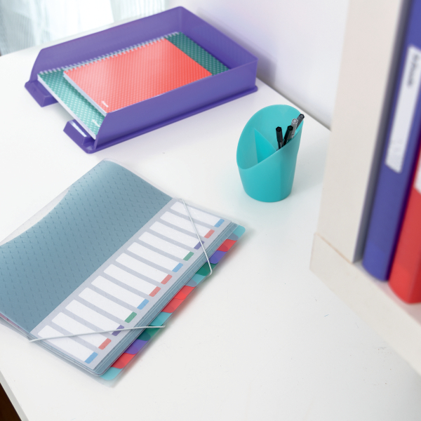 Lekka teczka segregująca Esselte Colour'Breeze A4 idealnie nadaje sie do porządkowania dokumentów i projektów lub do przechowywania materialów i dokumentów, które są nam czesto potrzebne.