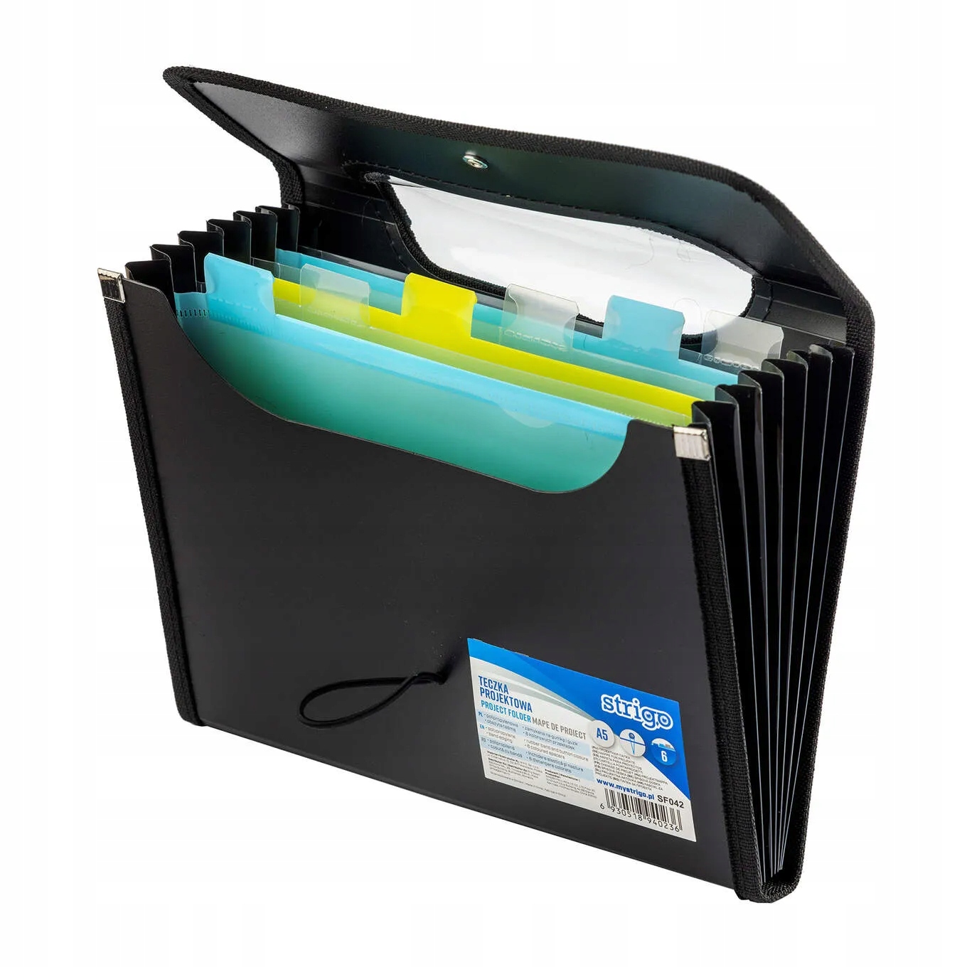 Czarna teczka VFILE STRIGO w formacie A5 posiada 6 kolorowych przekladek z indeksem i miejsce na wsuniecie np.: karteczki z informacją.