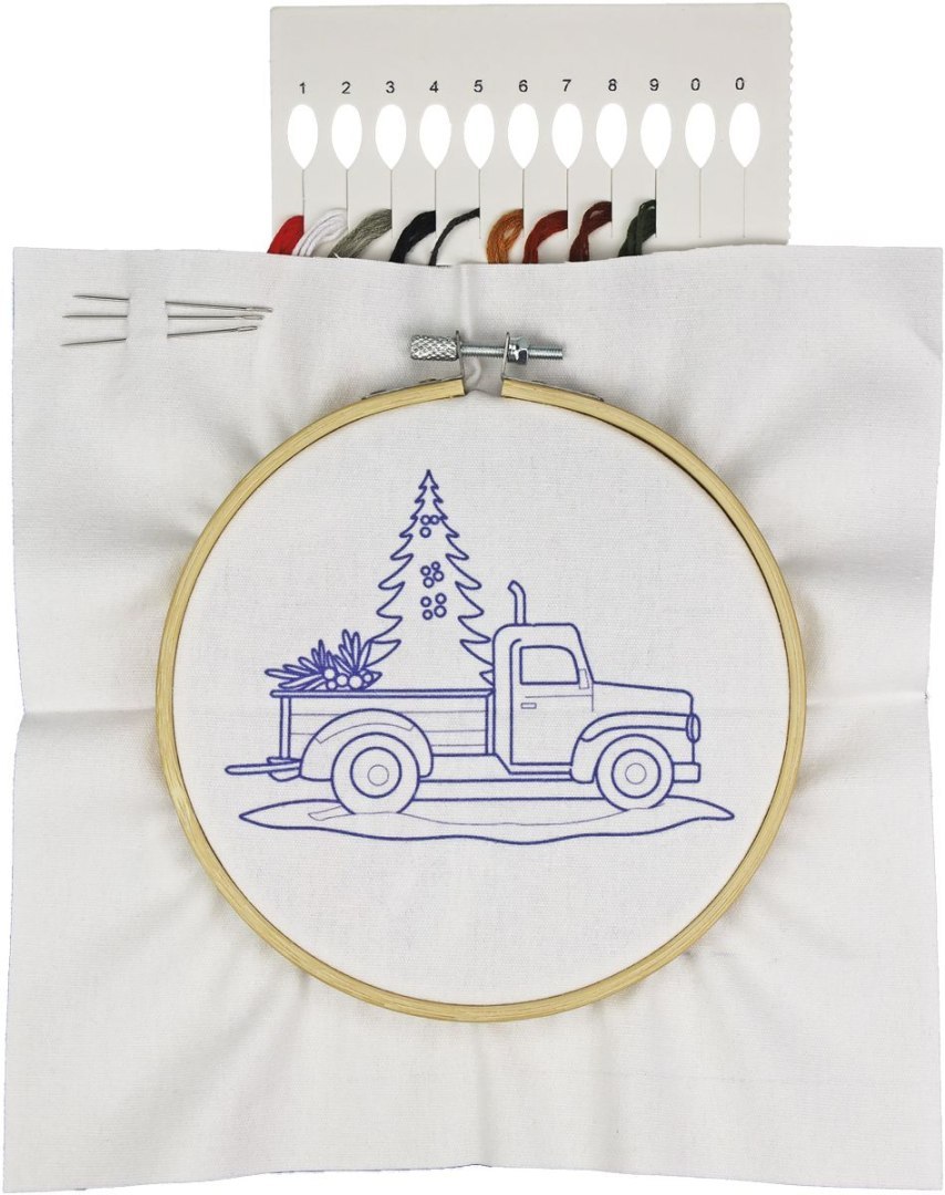 - Gotowy zestaw do haftowania, zawierający: tkaninę 24x24 cm ze szkicem wzoru, tamborek o średnicy roboczej 15 cm, zestaw mulin, 3 igły, instrukcję w języku polskim.