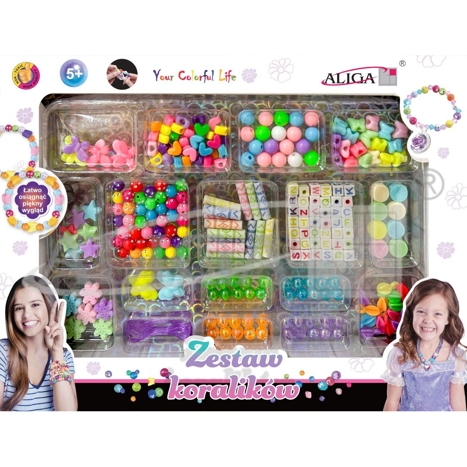 Zestaw koralików plastikowych mix kolorów i kształtów op. ok. 230szt.+2x 120cm żyłka PJ-2036 ALIGA