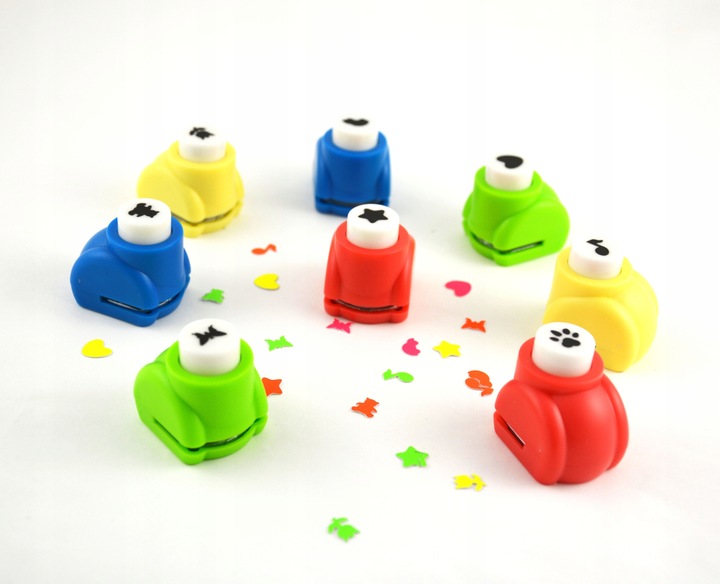 Dziurkacz w 4 kolorach posiada 8 różnych, unikatowych wzorów: nutka, tulipan, motylek, gwiazdka, serduszko, łapka, autko, miś.