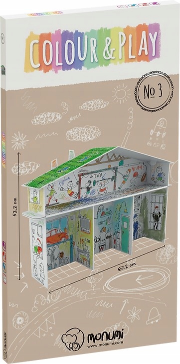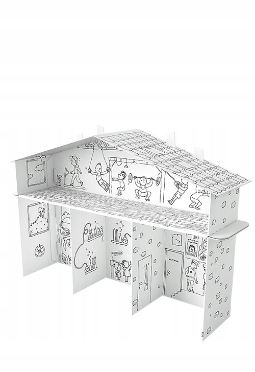 Przestrzenny, wielopietrowy domek-kolorowanka wykonany z wytrzymalej tektury oklejanej bialym kartonem. Duze, precyzyjnie wyciete elementy, latwe do zlozenia bez kleju czy nozyczek. Obrazkowa instrukcja na tyle opakowania. Ruchome cześci, okienka, otwarte przestrzenie, póleczki uatrakcyjniają konstrukcje. Zlozona konstrukcja jest stabilna, wytrzymala i lekka. Profesjonalna grafika, wyraLny druk w kolorze czarnym. Odpowiednia do kolorowania kredkami, flamastrami, markerami i farbami. Karton dobrze absorbuje wilgoc, nie falduje sie i nie przecieka.