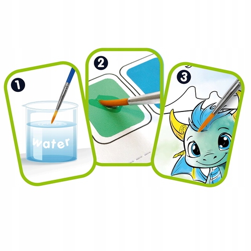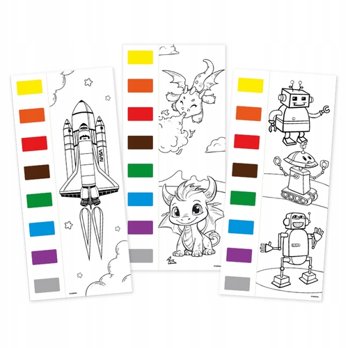 Zestaw składa się z notesu do malowania wodą z 10 szablonami do malowania oraz z 8 farbkami i 1 pędzelkiem.