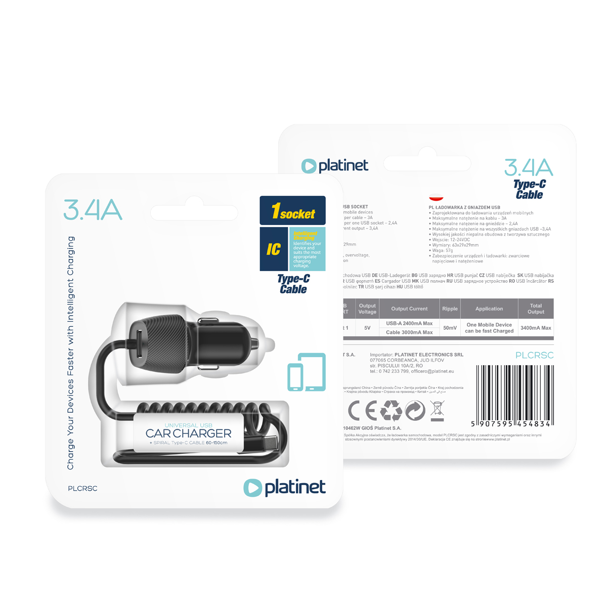 Ładowarka samochodowa USB-A 3,4A + kabel USB-C 15W PLATINET SPIRAL czarna (45483) - xa 0353047