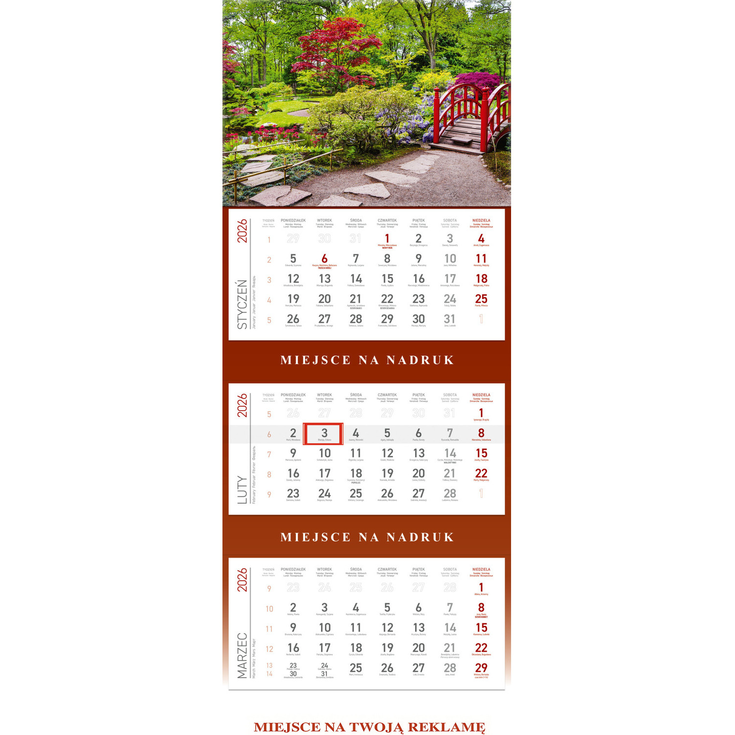 Możliwość wykonania nadruku reklamowego pomiędzy kalendariami oraz na dole kalendarza.