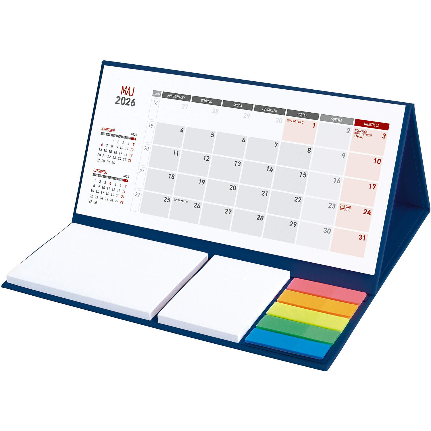 Praktyczny kalendarz stojący na biurko z przejrzystym kalendarium w układzie trzymiesięcznym. Poręczne samoprzylepne karteczki do notowania.