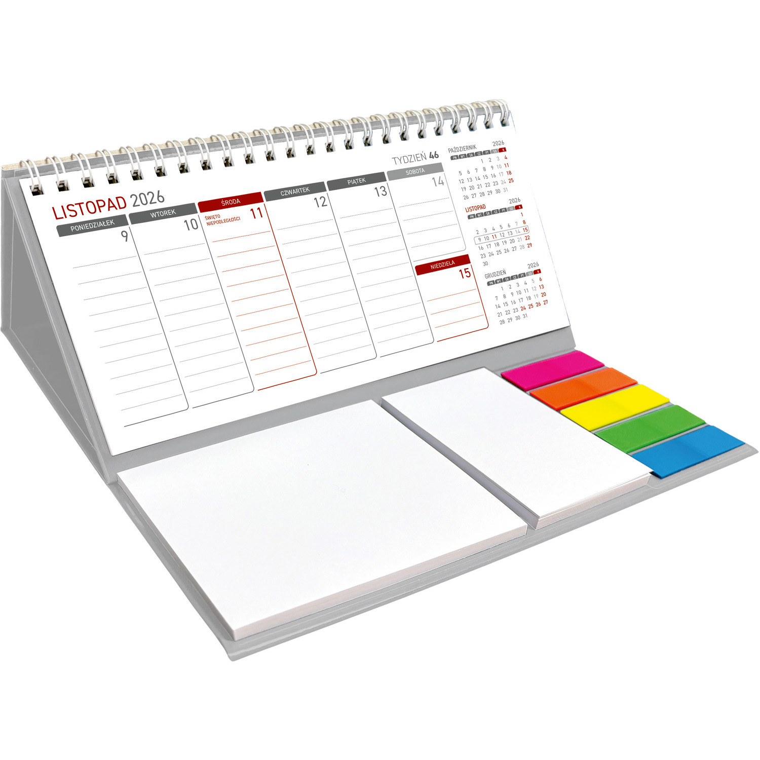 Praktyczny kalendarz stojący na biurko z przejrzystym kalendarium w układzie tygodniowym z miejscem do notowania. Poręczne samoprzylepne karteczki.