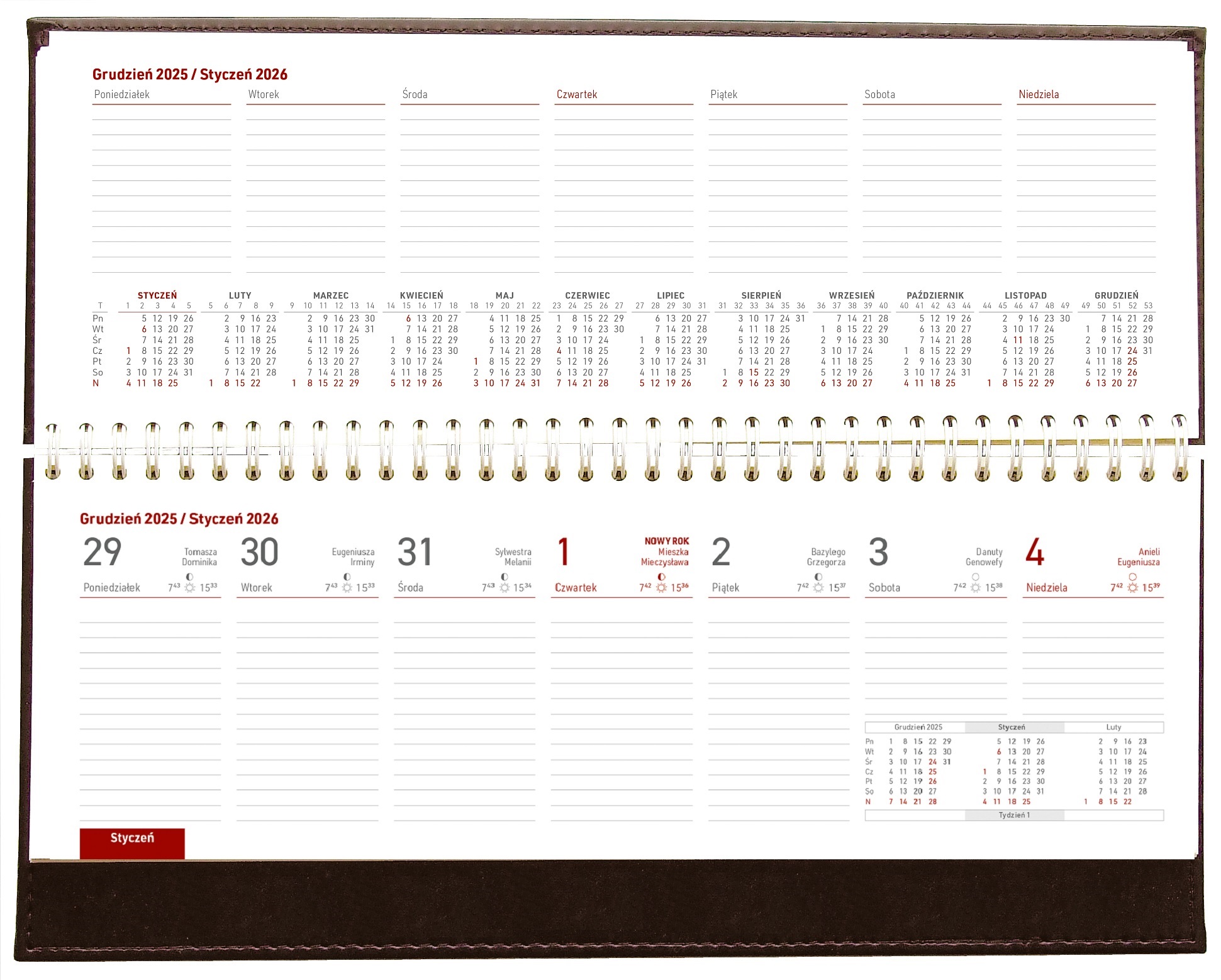 Terminarz biurkowy w eleganckiej oprawie z Vivelli. Okładka obszyta nićmi. Przejrzyste kalendarium w układzie tygodniowym, skrócone kalendarium trzech miesięcy, zaznaczone święta i daty imienin.
