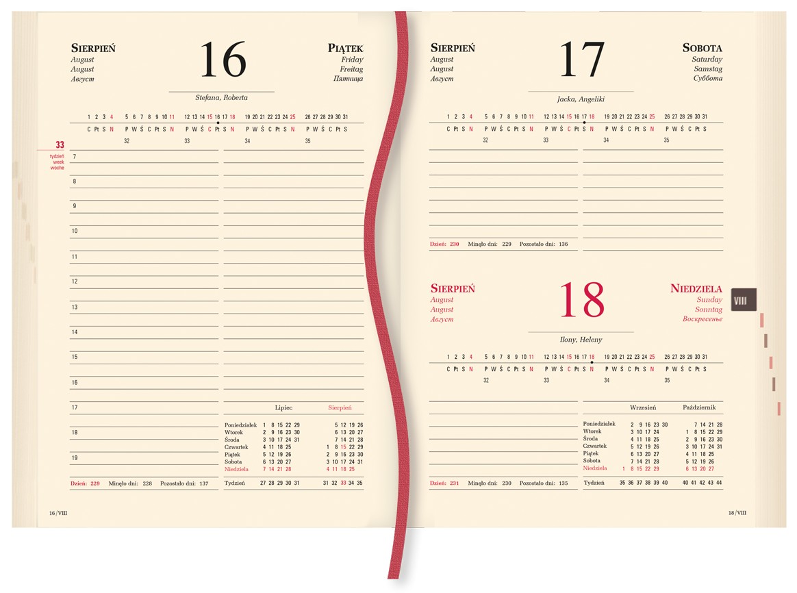 Terminarz wyposazony jest w skóropodobną oprawe Vivella , która nie tylko nadaje mu elegancji , ale równiez zwieksza trwalośc i odpornośc na uszkodzenia . Dodatkowo, zawiera tasiemke, która pozwoli Ci latwo znaleLc aktualną strone.