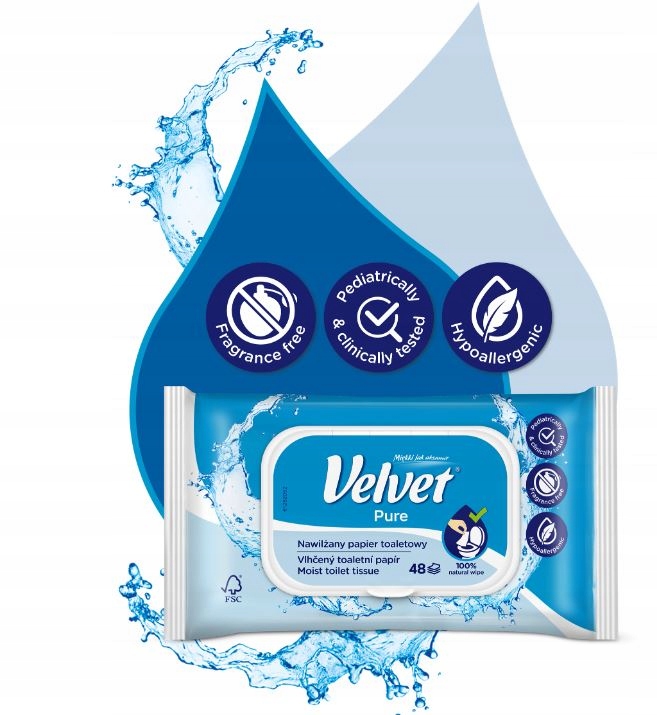 Nawilżany papier toaletowy Velvet Pure to delikatna pielęgnacja okolic intymnych oraz uzupełnienie codziennej higieny toaletowej dla każdego! Produkt przeznaczony jest dla skóry normalnej i wrażliwej.
