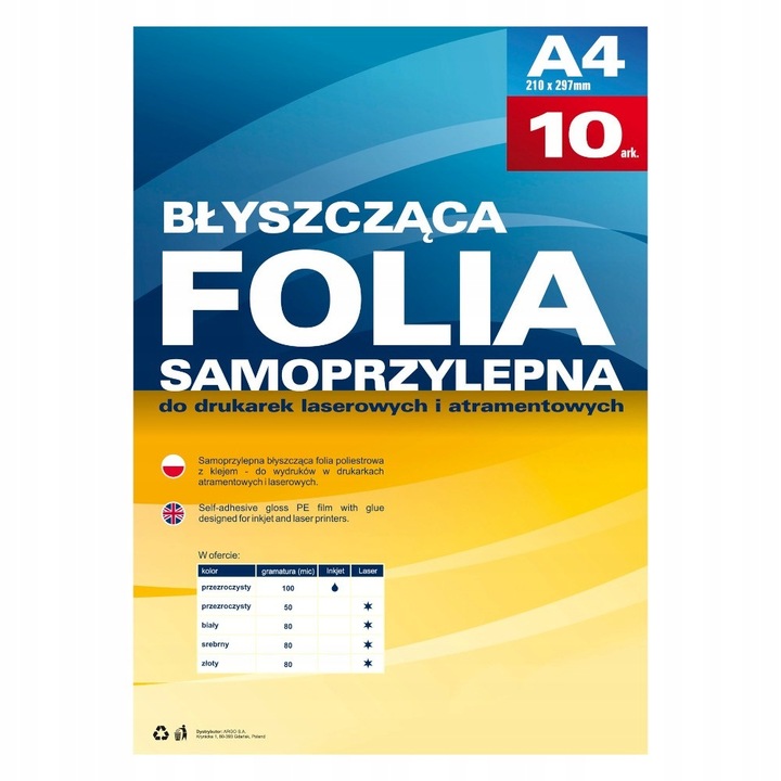 Folia błyszcząca samoprzylepna do drukarek laserowych poliestrowa z klejem do wydruków w drukarkach laserowych.