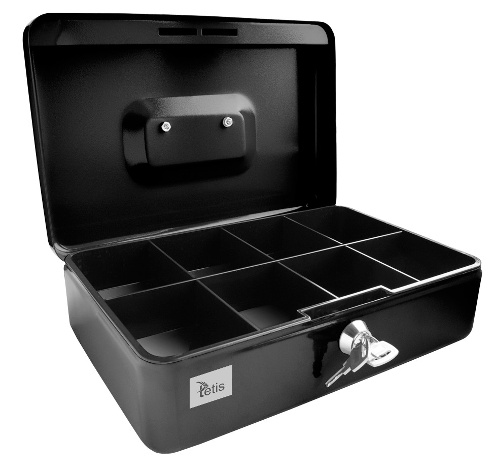 Kasetka metalowa w rozmiarze 10” ze składanym uchwytem do przenoszenia. Lakierowana obudowa. Jest wyposażona w tackę z ośmioma przegródkami. Posiada dodatkowy schowek pod wyjmowaną tacką. Zamknięcie na zamek bezpieczeństwa z dwoma kluczami.
