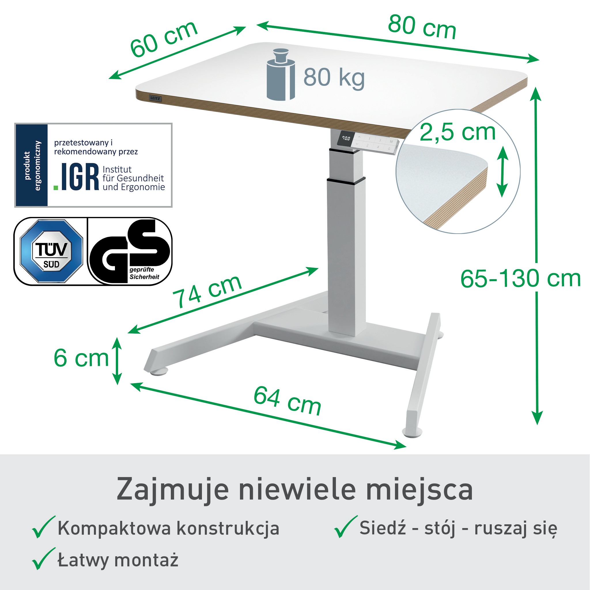 Kompaktowa konstrukcja z blatem o wymiarach 80 x 60 cm umozliwia elastyczne uzytkowanie biurka jako biurka tymczasowego w miejscach o ograniczonej przestrzeni.