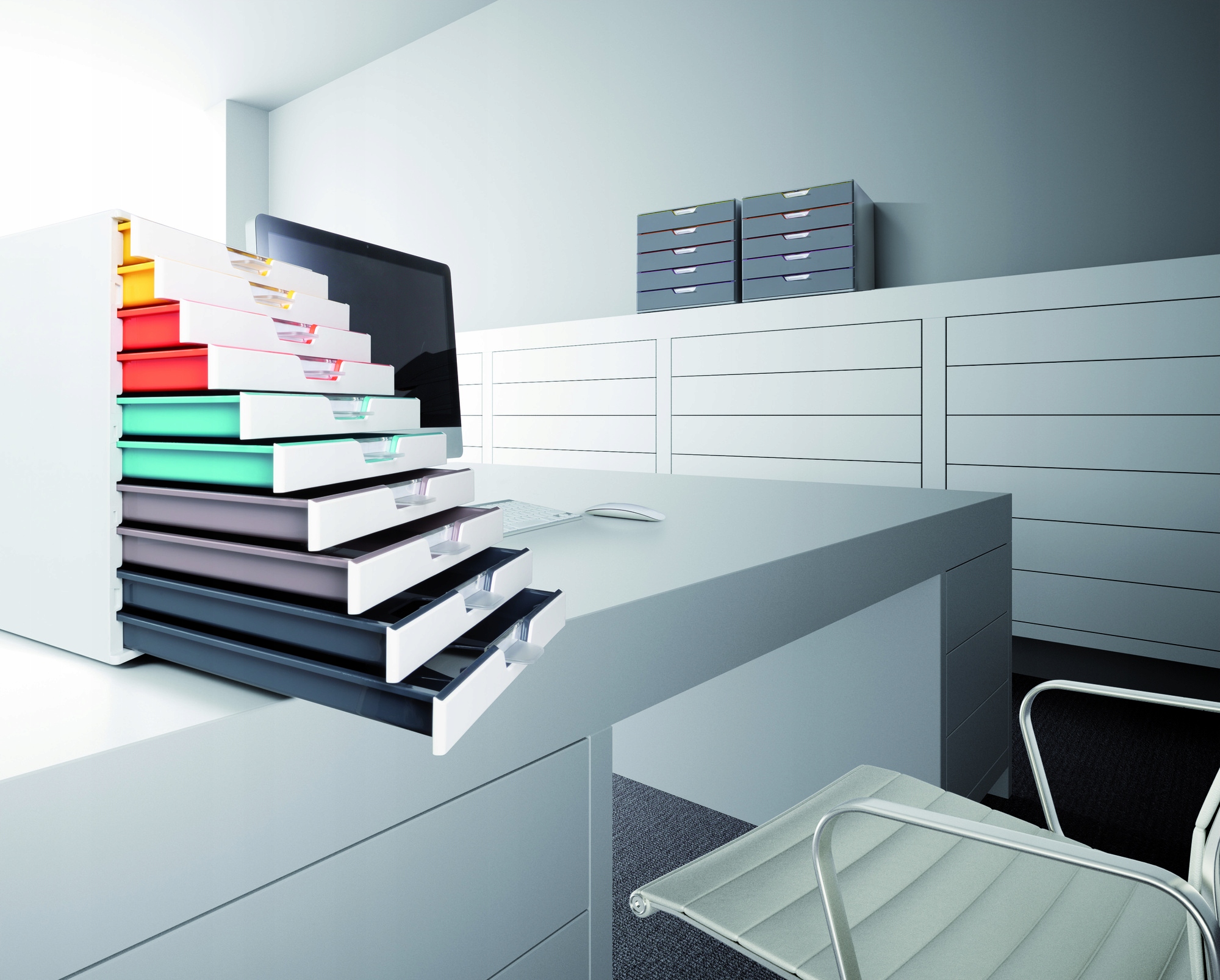 Ponadczasowy, elegancki pojemnik z 10 kolorowymi szufladami umozliwiający segregacje i latwą orientacje w dokumentach.