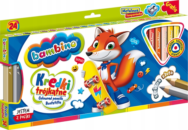 Wykonane z glinki kaolinowej kredki Bambino w drewnianej oprawie i o wygodnym trójkątnym przekroju, produkowane w Polsce. Idealne do rysowania, wypelniania duzych plaszczyzn i wykonywania miekkich przejśc pomiedzy kolorami.