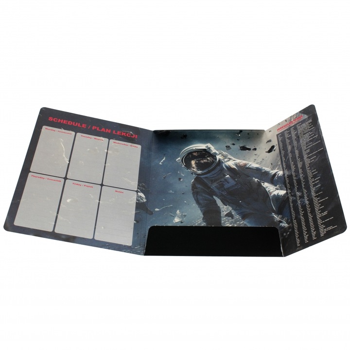 Teczka jest laminowana, dzięki temu bardziej trwała i ozdobiona młodzieżową grafiką.