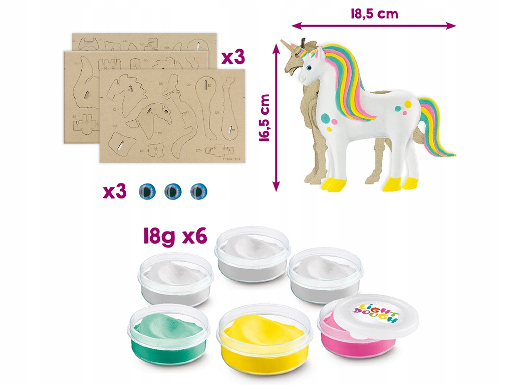 Wyjątkowa forma numerowanych puzzli pozwala zlozyc drewniany szkielet jednorozca w wymiarze 3D, aby nastepnie wymodelowac jego sylwetke przy uzyciu masy plastycznej.