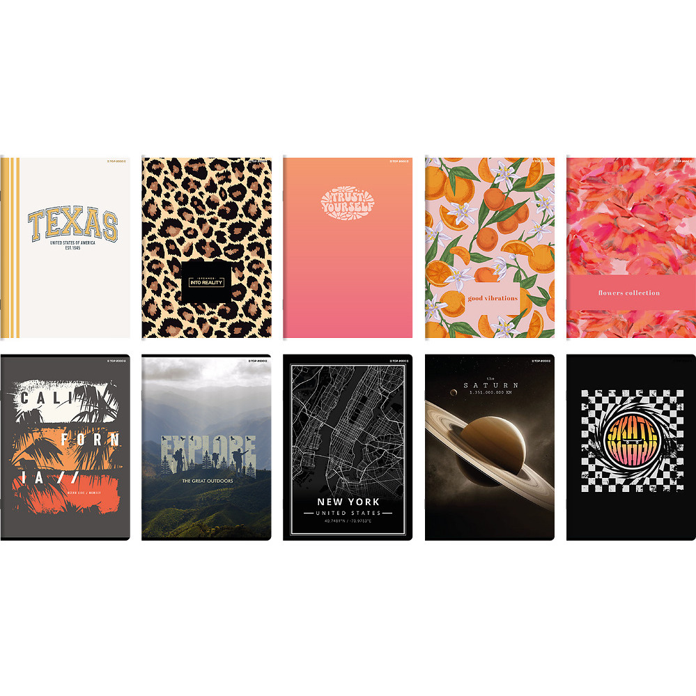 Kolekcja Top 2000 została stworzona po to, aby zapewnić klientowi największy wybór różnorodnych okładek w atrakcyjnej cenie. Same podstawowe formaty i liniatury, uniwersalne grafiki trafiające w obecne trendy oraz style, które bez trudu wybierze uczennica i uczeń każdej klasy. Zastosowany papier jest nieco cieńszy niż w pozostałych produktach marki Top 2000, jednak produkty nie tracą przez to na jakości. Stają się lżejsze, poręczniejsze i odpowiadają preferencjom innych grup użytkowników. Kolekcja Basic to najlepszy wybór dla każdego, kto ceni sobie jakość, styl, funkcjonalność i jednocześnie poszukuje produktu na niższym poziomie cenowym.