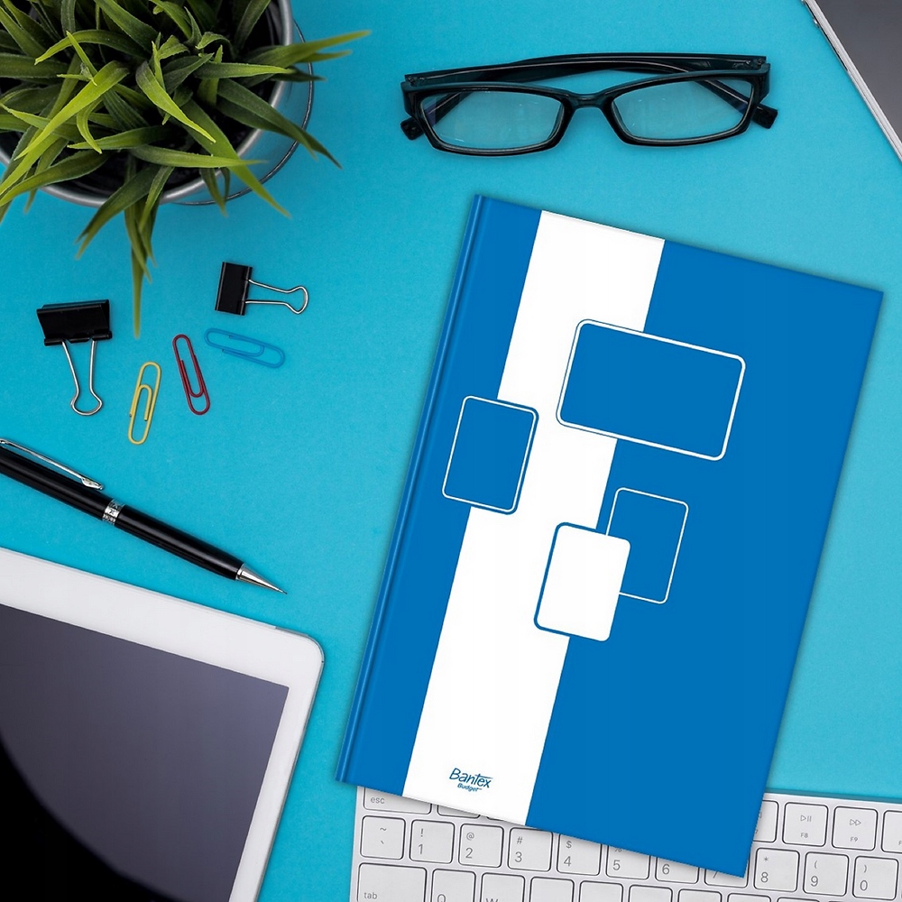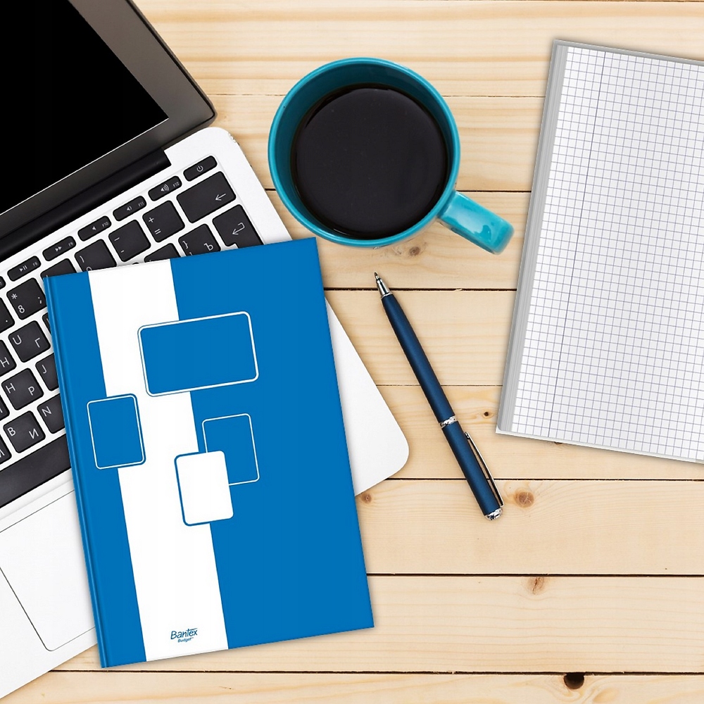 Funkcjonalne, lekkie bruliony w kratke z marginesem. Twarda, bialo-niebieska, laminowana oprawa zapewnia ochrone dla notatek.