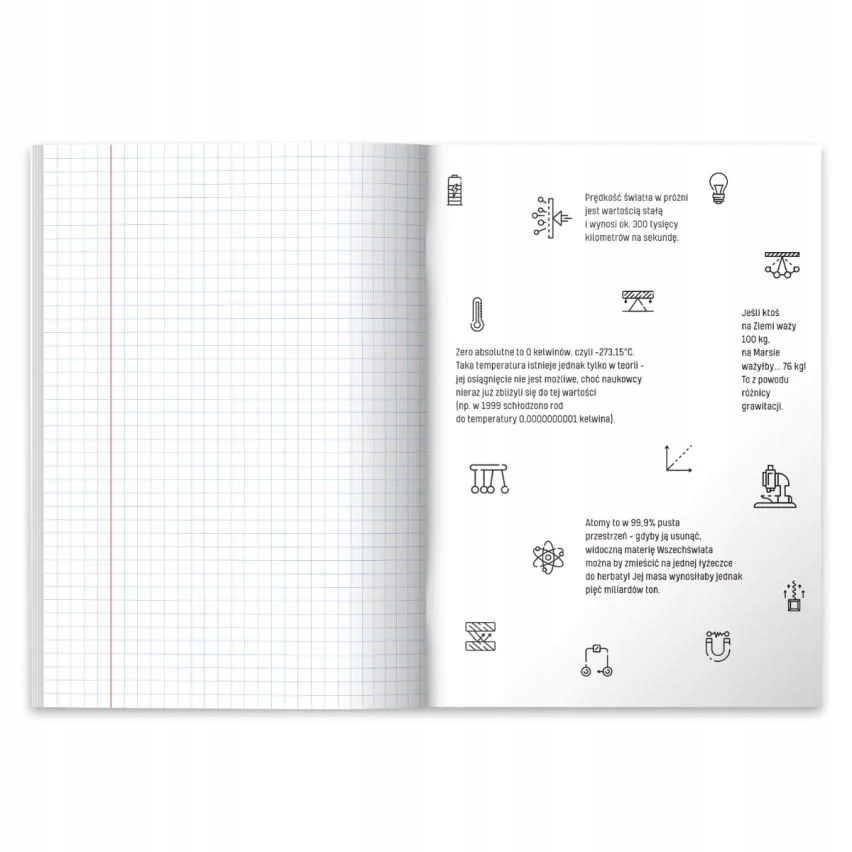 Zeszyt do fizyki dla wszystkich uczniów. Okladka wykonana z grubego papieru jest miekka w dotyku dzieki wykonczeniu folią soft touch. Na froncie, oprócz nazwy przedmiotu, znajduje sie zabawny tekst a na okladce wewnetrznej są najwazniejsze zagadnienia z danego przedmiotu! Taka "mala ściąga" dla kazdego!
