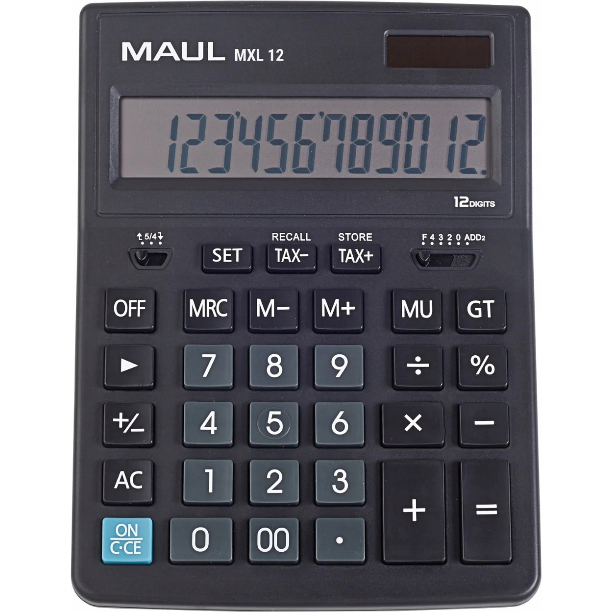 Solidny, wytrzymaly kalkulator biznesowy MAUL MXL 12 w kolorze czarnym z duzym, 12-pozycyjnym wyświetlaczem LCD. Niezawodny, dokladny i o profesjonalnym wyglądzie. Szybsze wyszukiwanie: przyciski funkcyjne i numeryczne w róznych kolorach. Ergonomiczny: wyświetlacz umieszczony pod kątem dla ulatwionego odczytu. Duzy rozmiar i wyraLniejszy wyświetlacz pozwalają na wiekszy komfort pracy. Przyciski z tworzywa sztucznego: wytrzymale i latwe do czyszczenia. Z antypoślizgowymi, gumowymi punktami na odwrocie. Energooszczedny, dzieki podwójnemu zasilaniu baterią i baterią sloneczna, z funkcją automatycznego wylączania. Wyposazony w 3 przyciski pamieci, obliczanie procentów, podatków, przycisk z podwójnym zerem, zmiana znaku, kasowanie ostatniej pozycji. Dodatkowo mozliwośc automatycznego zaokrąglania w góre lub w dól oraz wyświetlanie cyfr po przecinku. Gwarancja: 5 lat. Wymiary: 20,5 x 15,5 x 3,5 cm. Zawiera jedną baterie (LR44). Ekologiczne opakowanie z tektury, bez uzycia plastiku, z eurozawieszką.