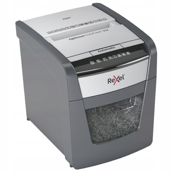 Niszczarka automatyczna do papieru Optimum AutoFeed+ 50X jednorazowo niszczy automatycznie do 50 kartek A4 (80 gsm), tnąc arkusze na konfetti (o wymiarach 4 x 28 mm), co zapewnia poziom bezpieczenstwa P-4.