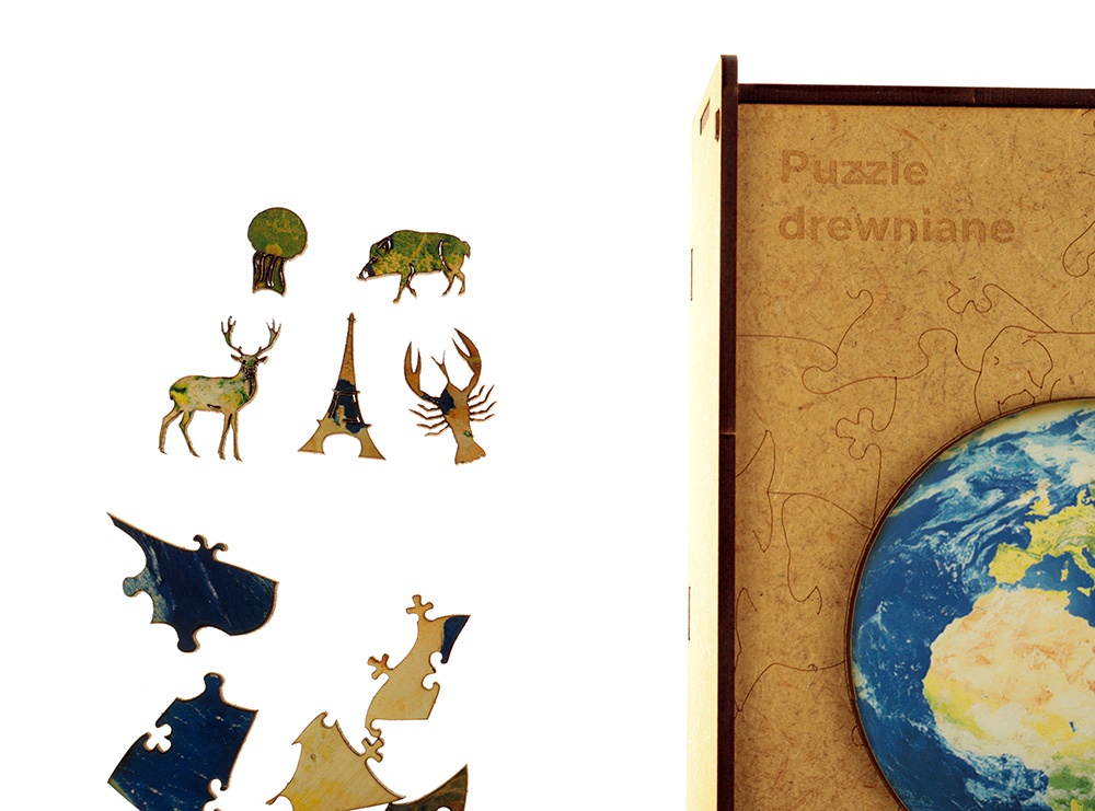 - Kolorowe, drewniane puzzle dostępne w różnych wzorach.